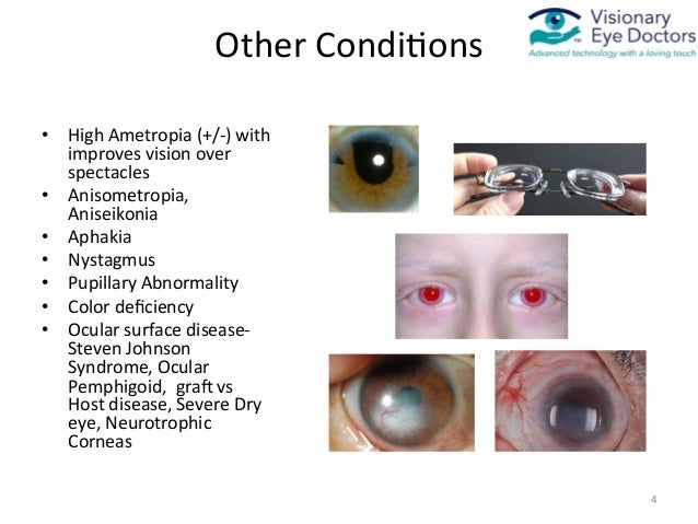 And visual acuity improvement of 2 lines or more with contact lenses Anisometropia. H4420 H4421 H4422 And H4423 1. Binocular vision issues caused by the presence of nystagmus anseikonia and anisometropia as well as glare and light.